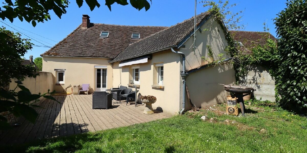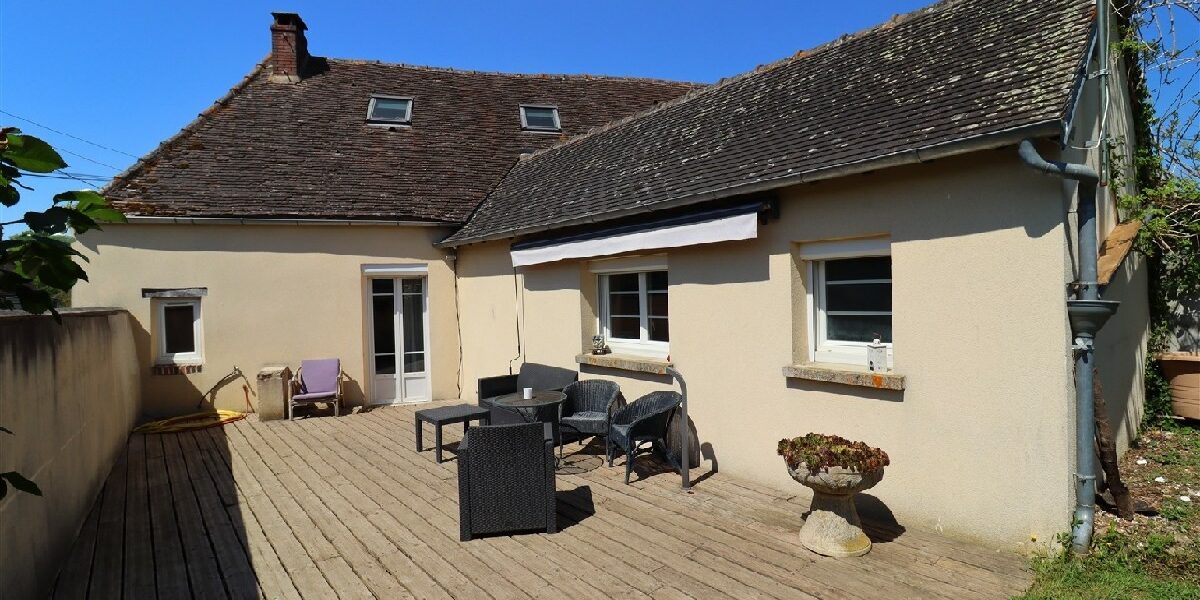 Terrasse avec store banne donnant sur jardin clos sans vis à vis.