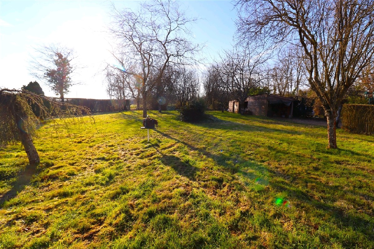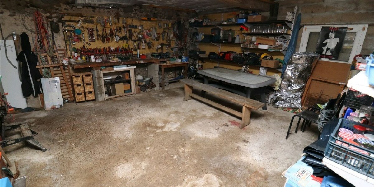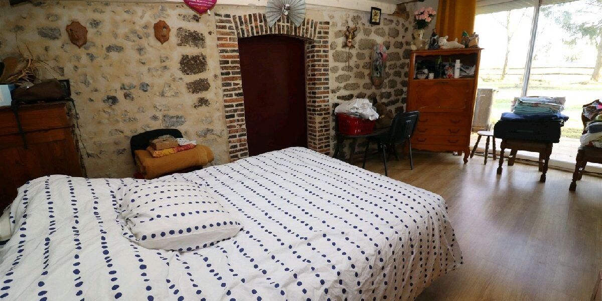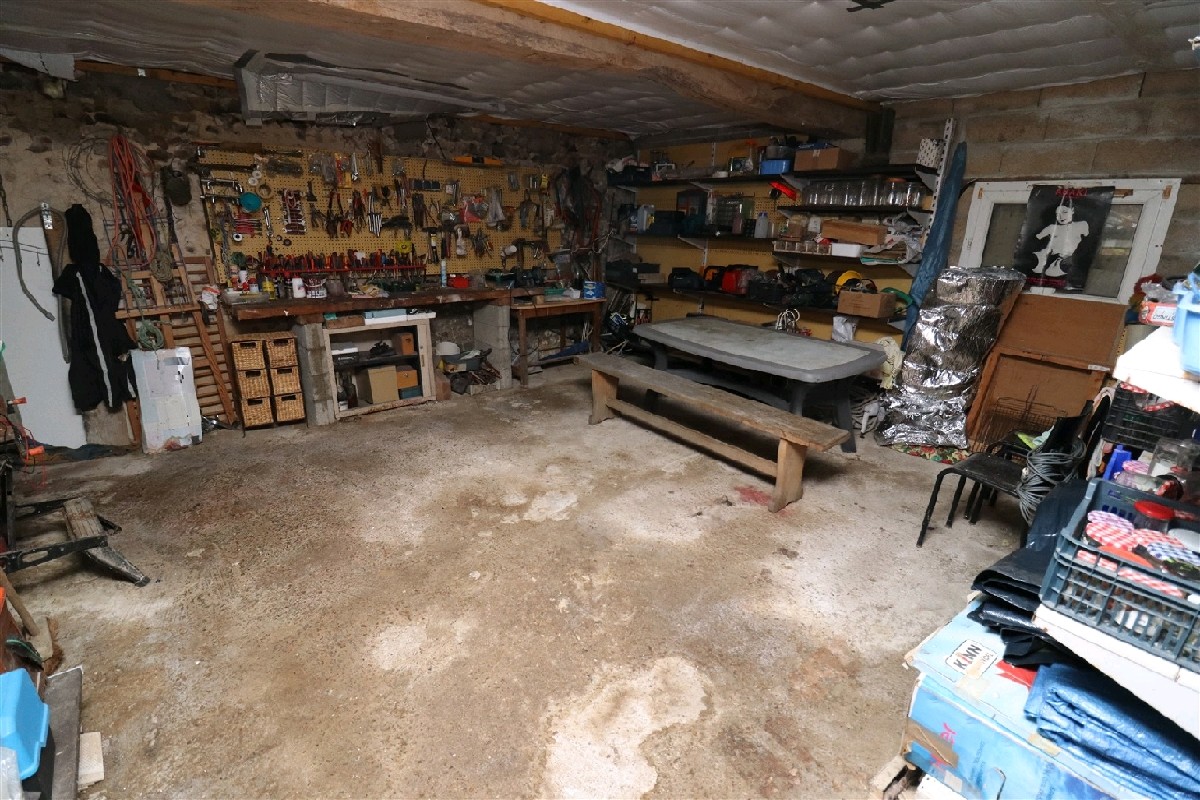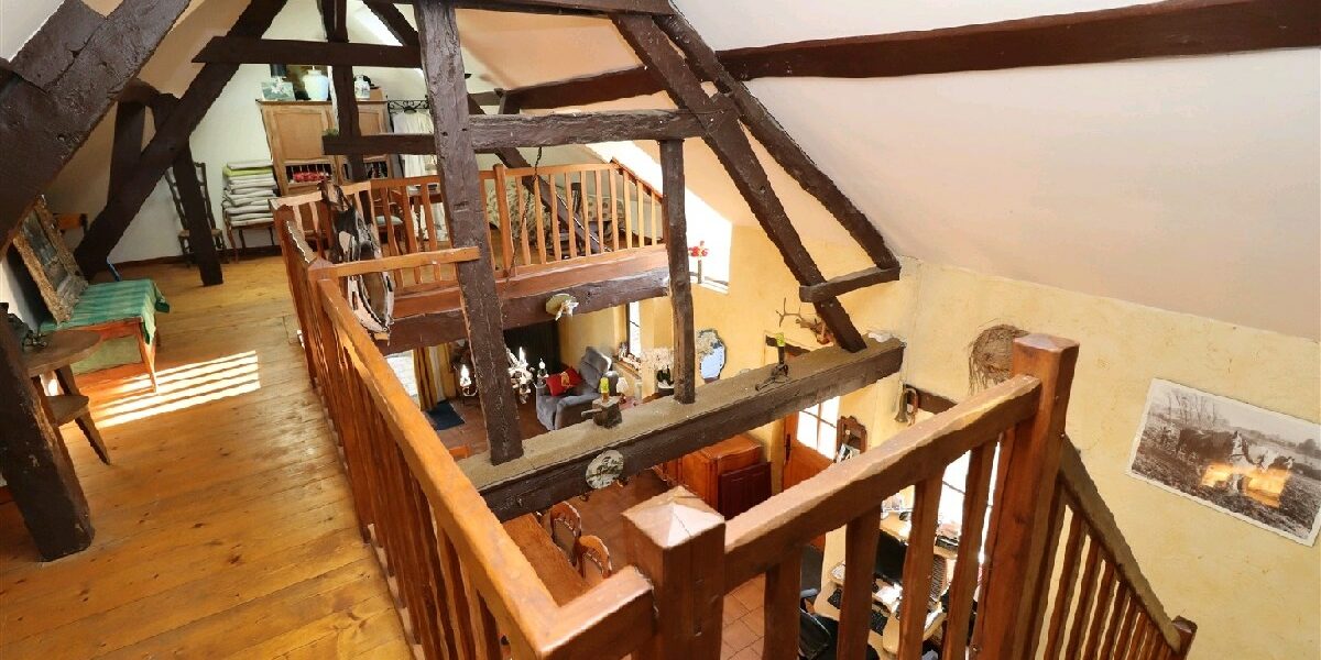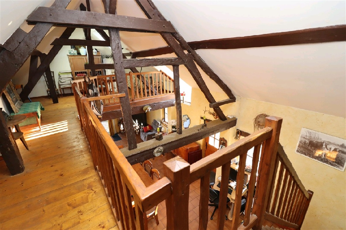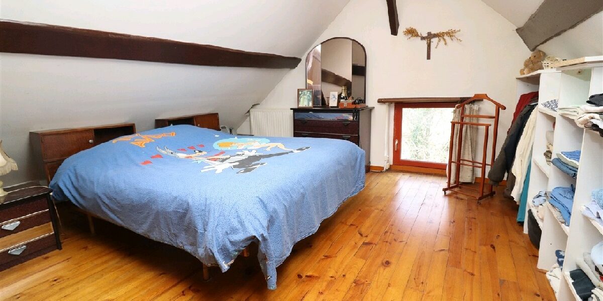 A létage : 3 chambres, bel espace ouvert (toit cathédral), salle deau avec wc. Chaudière neuve, double vitrage PVC et aluminium. Il reste 80 m² aménageables.