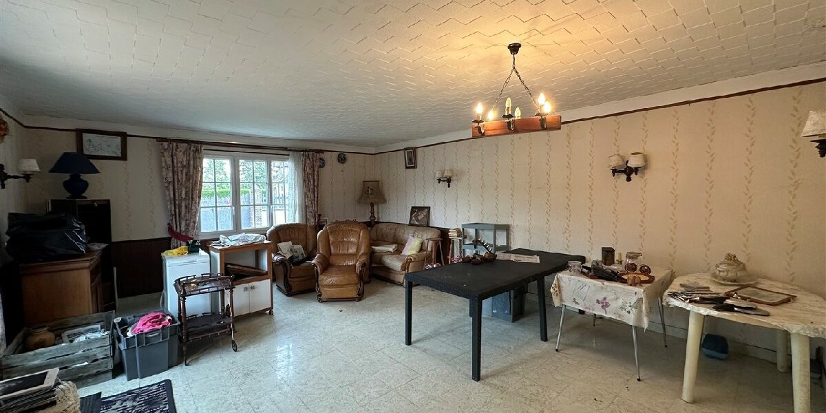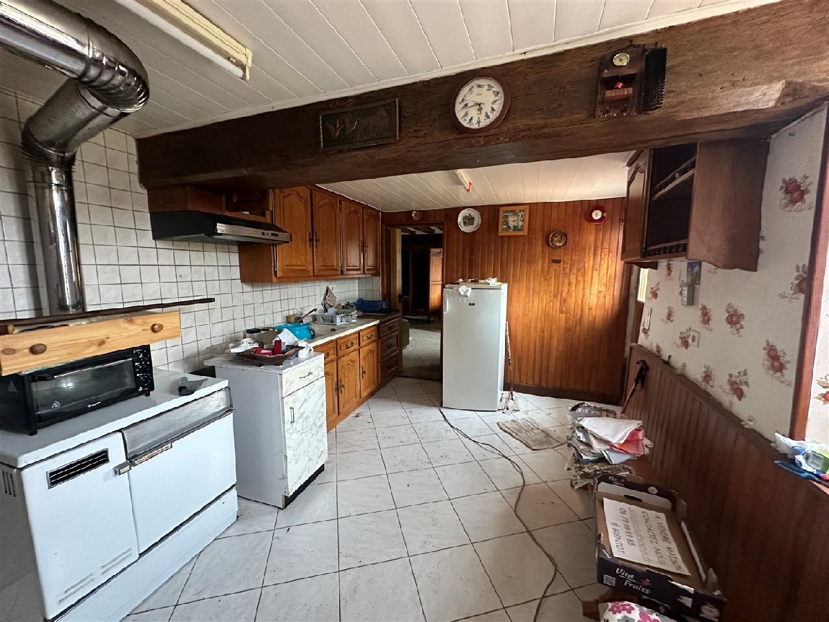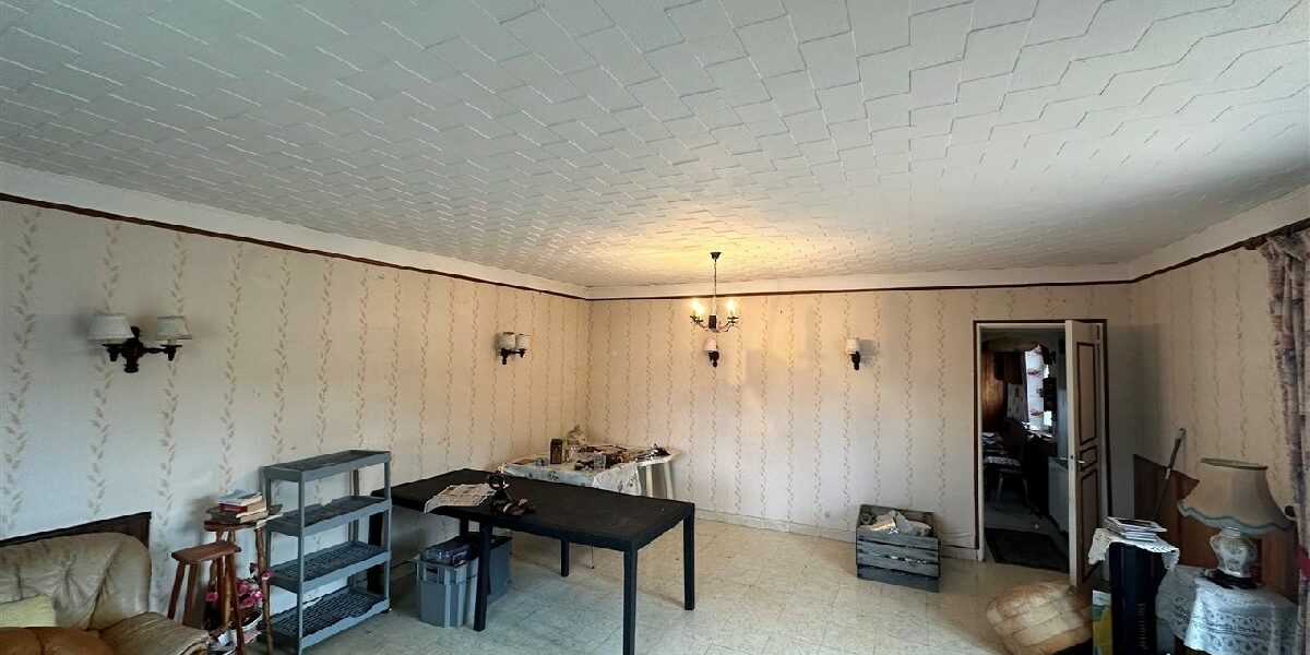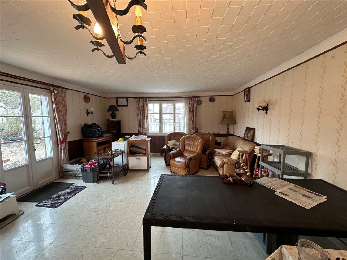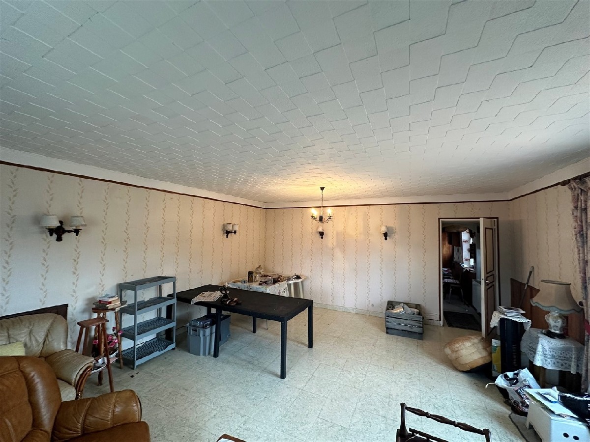 Une maison d’habitation type longère comprenant: entrée, salon-salle à manger, cuisine, salle de bains, wc, chambre.