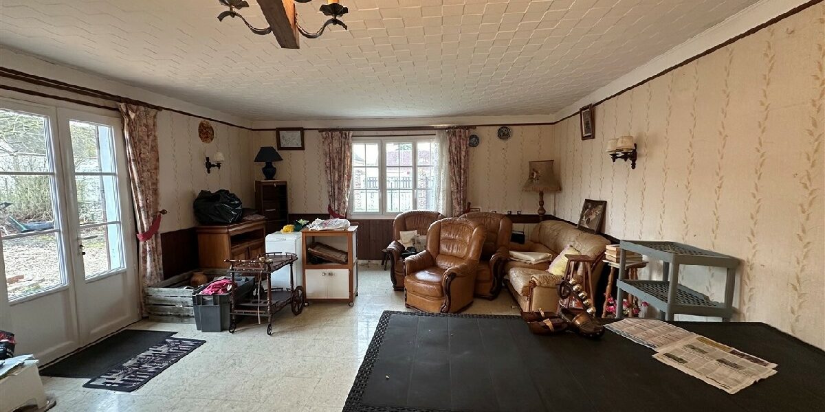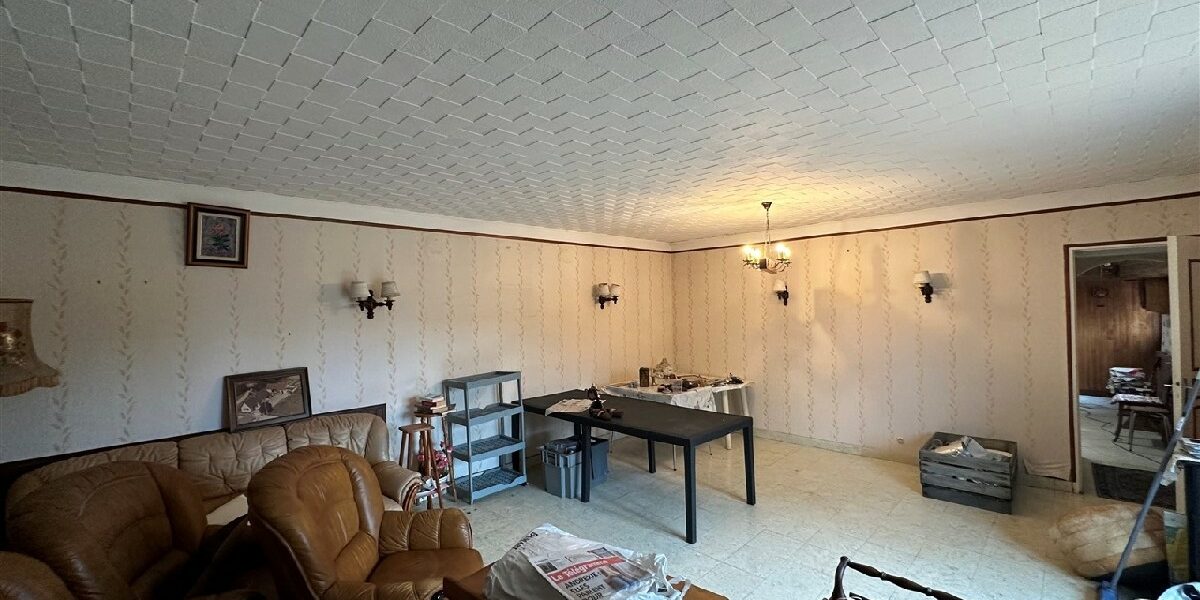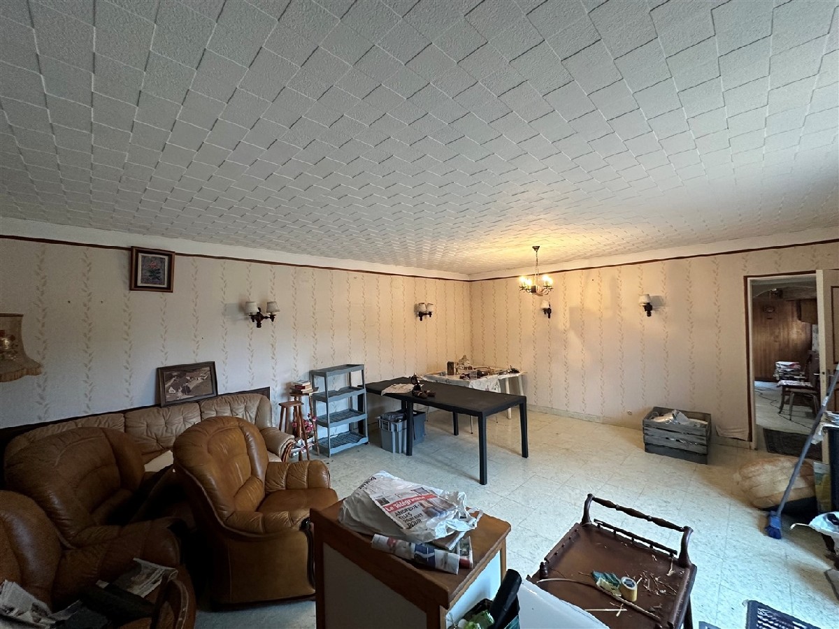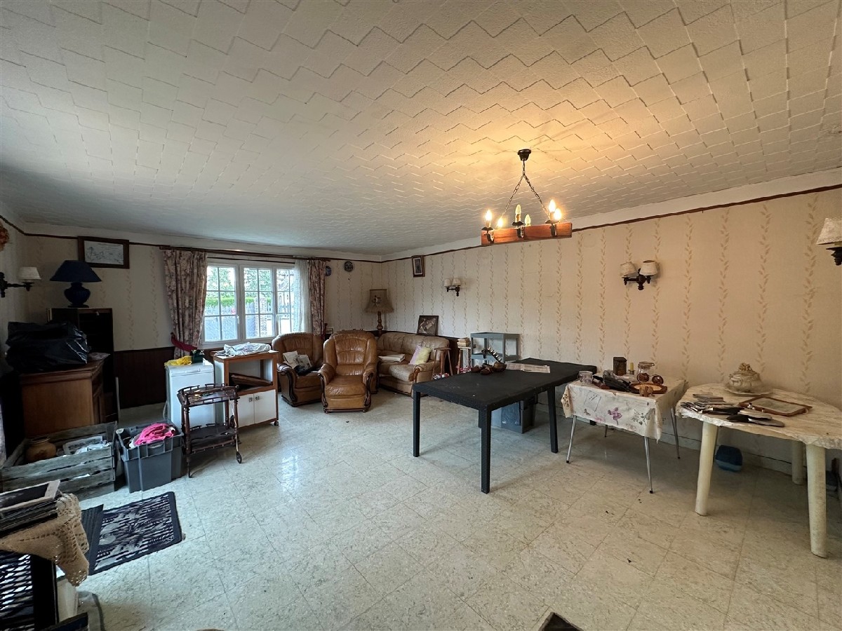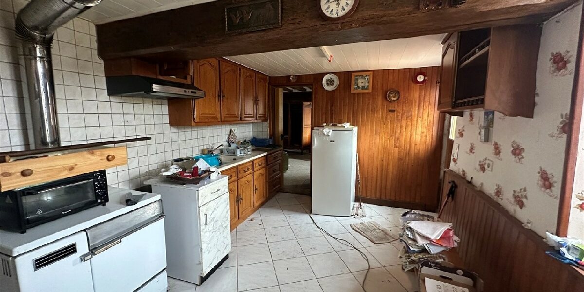 Une maison d’habitation type longère comprenant: entrée, salon-salle à manger, cuisine, salle de bains, wc, chambre.