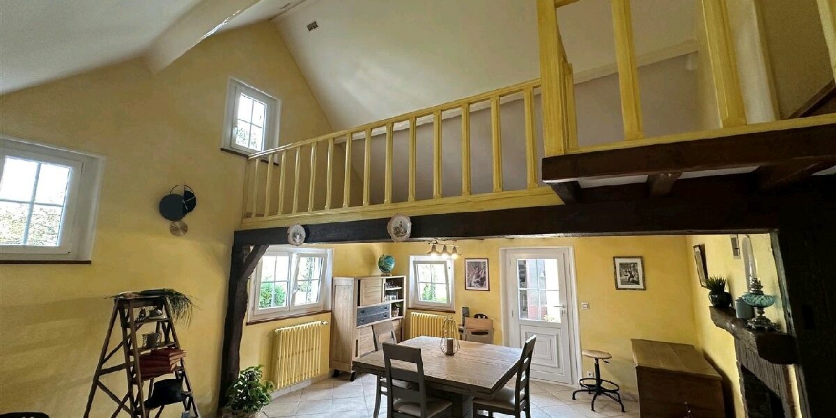 A quelques minutes de tréon, maison dhabitation en parfait état avec énormément de cachet comprenant entrée, cuisine aménagée et équipée, vaste séjour-salon semi cathédrale avec cheminée insert, bureau, salle deau à litalienne, WC, cave / garde-manger, chaufferie. A létage palier desservant 3 chambres, salle de bains, mezzanine. Dépendance divisée en 3 pièces chauffées. Double garage (avec éléctricité et appentis). Le tout sur 1807m² de terrain clos et arboré avec bassin d’ornement. AUCUN TRAVAUX A PREVOIR !