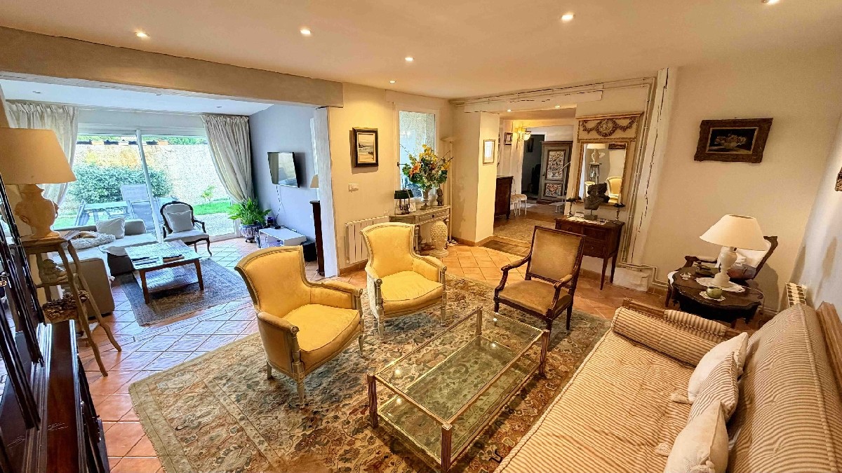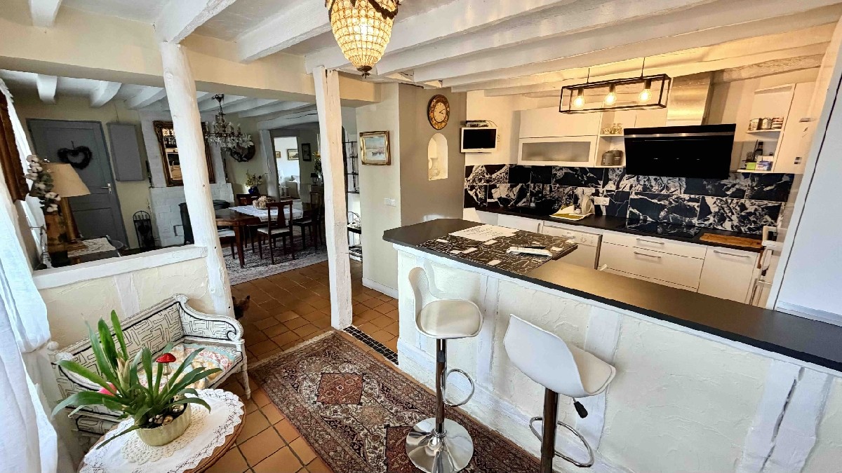 Entrée, cuisine aménagée et équipée (neuve) ouverte sur salle à manger, grand salon ouvert sur véranda.
