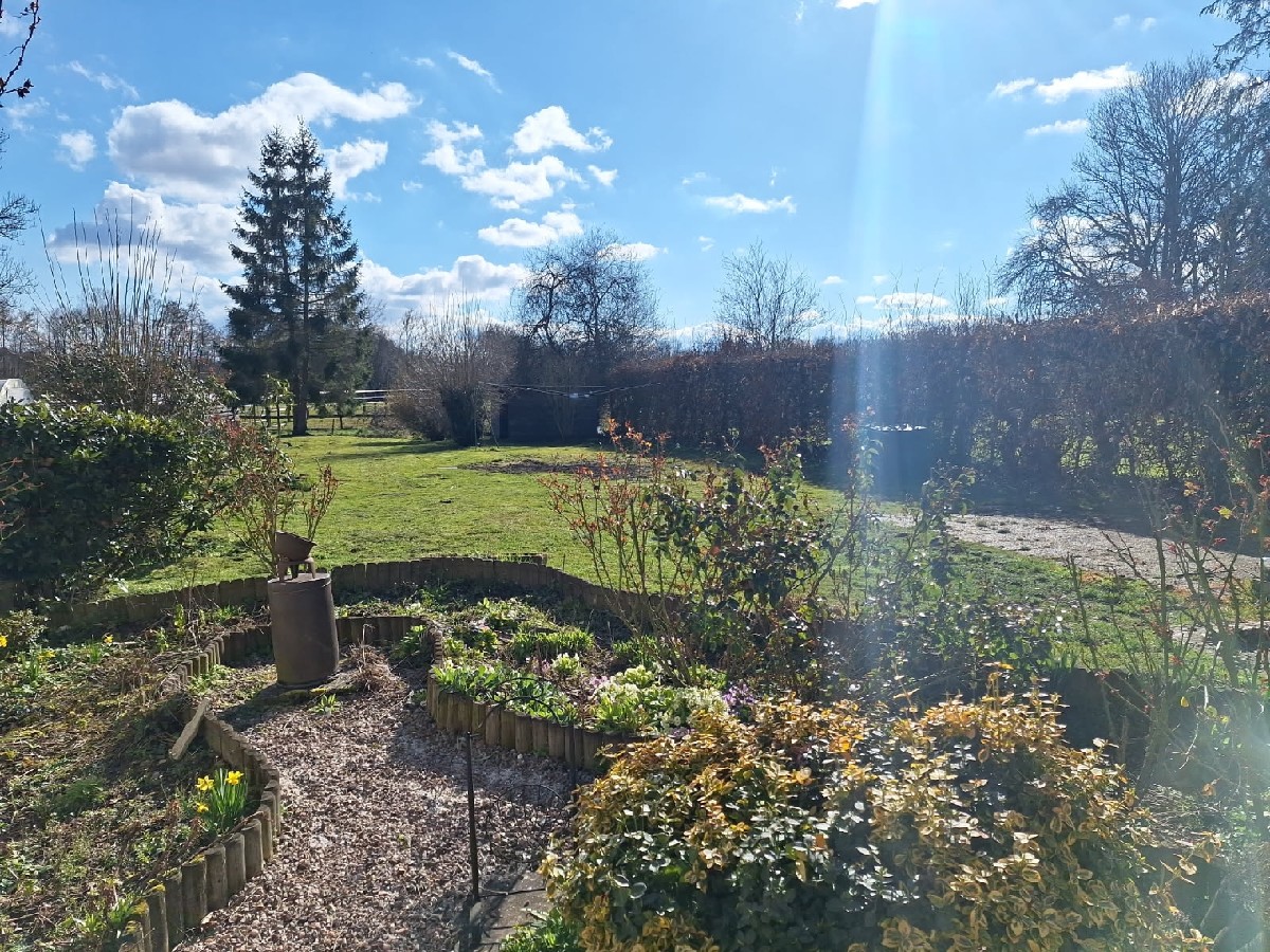 A l’extérieur, un beau jardin de plus de 1000 m2 avec vue dégagée sur des prés, véranda, atelier, abris de jardin.