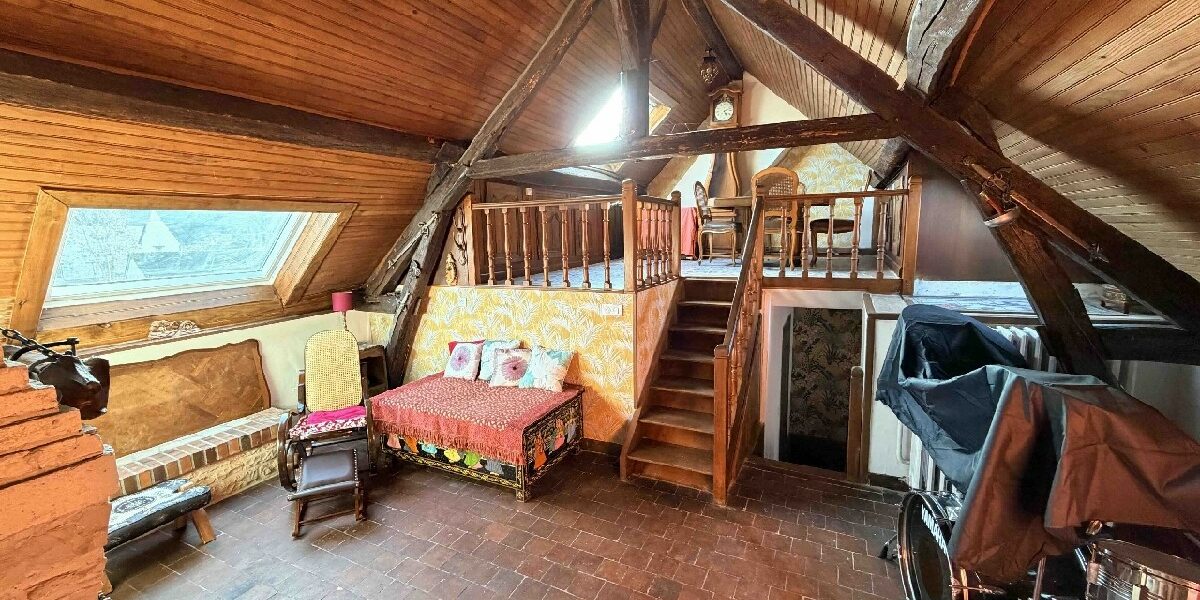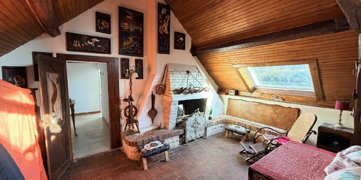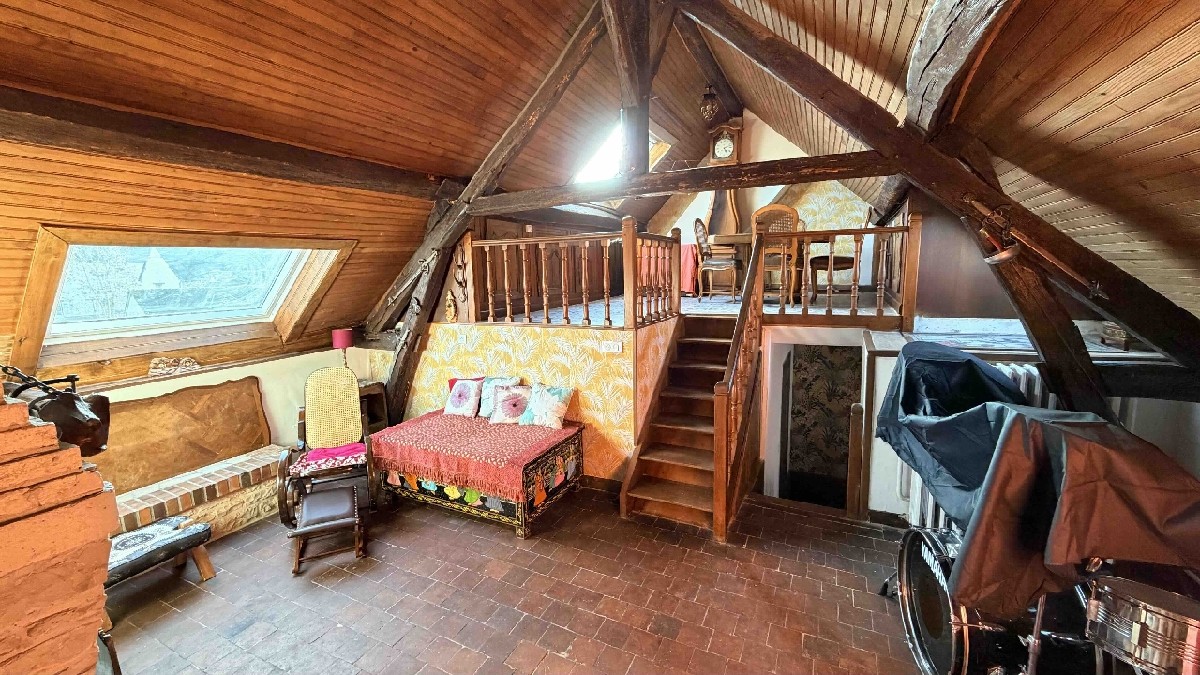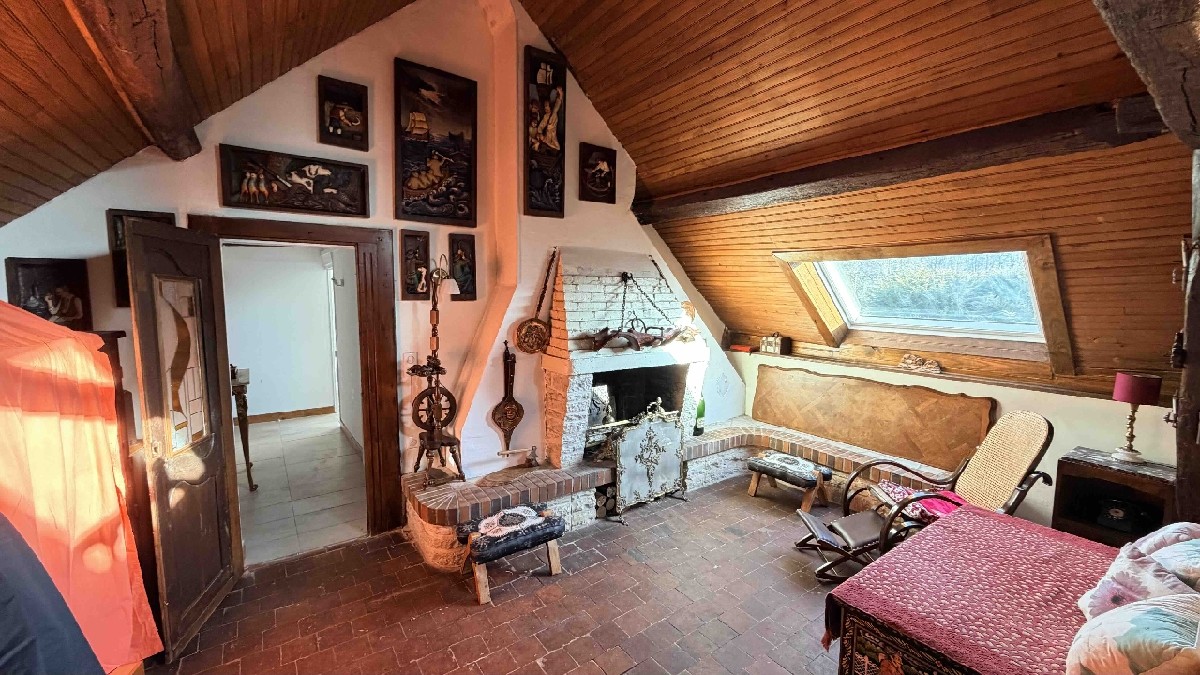 A l’étage : 3 chambres dont une avec toit terrasse, mezzanine, salon d’étage avec cheminée, salle de bains, wc.